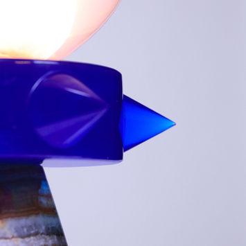 Collerette et ampoule en résine cristalline. Socle personnalisable en résine cristalline ou en onyx mexicain. Une représentation architecturale du corps féminin, composée d’une collerette cloutée et d’un Bulbe lumineux. Le socle, sculpté dans de l’onyx mexicain, apporte force et élégance