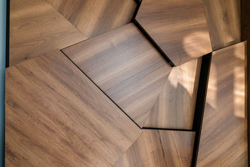 The highlight of the project is the bespoke creation of a library over 5 metres high, incorporating sliding mirrors reflecting the lake. The mirrors bring the light and atmosphere of the outside world into the house. The use of walnut and bronze mirrors combine harmoniously to create a subtle, structured mosaic effect.